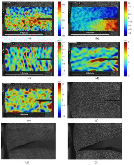 Displacement field, strain field, and photos of specimen S2 before and after fracture: (a) distribution field of vertical displacement U before the occurrence of the S2 fracture; (b) distribution field of horizontal displacement V before the occurrence of the S2 fracture; (c) distribution field of strain εx before the occurrence of the S2 fracture; (d) distribution field of strain εy before the occurrence of the S2 fracture; (e) distribution field of strain εxy before the occurrence of the S2 fracture; (f) photo before the occurrence of the S2 fracture (the original 2932th photo); (g) photo during the occurrence of the S2 fracture (the original 2933th photo); (h) photo after the S2 fracture (the original 2934th photo).