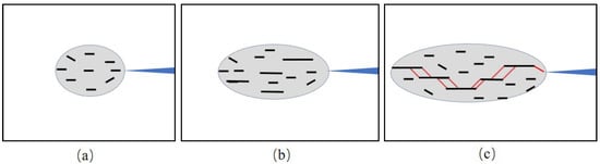 The three stages of the type-I crack structure from static loading to crack propagation: (a) there is stress concentration at the crack tip, and micro-cracks and the process zone appear; (b) the load continues to increase, the number of micro-cracks increases, and the process zone becomes larger; (c) when the load reaches the peak value, the micro-cracks penetrate each other, new macroscopic cracks appear, and the cracks expand.