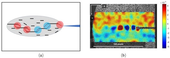 By observing the shear strain cloud map of each specimen, it was found that the high shear strain zone of almost all specimens was located in the process zone, the shear strain amplitude was significantly different from the surrounding area, and there were also many adjacent high shear strain zones. Regarding the obvious spacing, its overall distribution shape resembles a string of beads connected in a line; thus, it may be called a beaded high shear strain area. Comparing the crack morphology of the specimen after the fracture occurred, it could be seen that the beaded high shear strain area was especially obvious in the area where the macroscopic crack was bent and deflected. The positive and negative of the beaded high-shear strain region εxy was highly correlated with the spatial variation of the shape of the high-strain region on the horizontal strain εy distribution map.