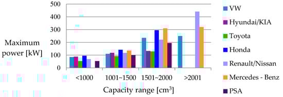 Maximum power in each engine capacity compartment; European and Asian car brands. Source: Developed own.