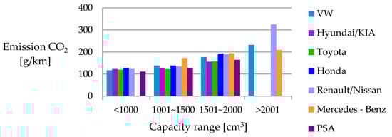 CO2 emissions in individual engine displacement compartments; European and Asian car brands. Source: Developed own.