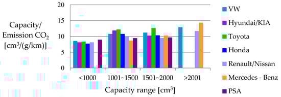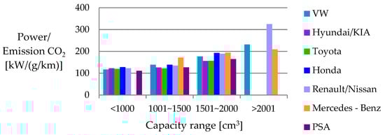 The ratio of maximum power to carbon dioxide emissions in the different engine capacity compartments; European and Asian car brands. Source: Developed own.