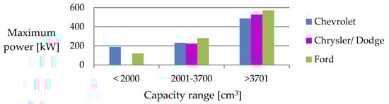 Maximum power in individual engine capacity ranges among American car brands. Source: Developed own.