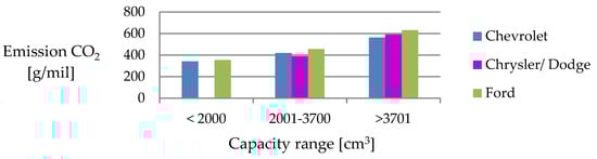 Carbon dioxide emissions in individual engine capacity ranges among American car brands. Source: Developed own.