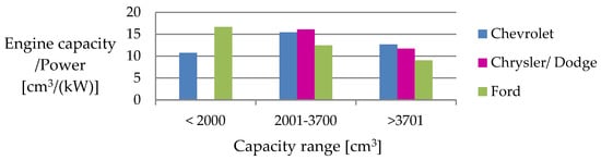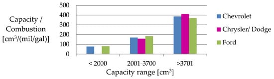 Ratio of capacity to combustion in individual engine capacity ranges among American car brands. Source: Developed own.