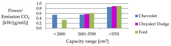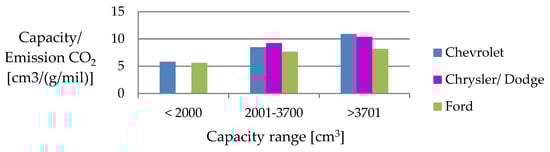Ratio of capacity to carbon dioxide emissions in individual engine capacity ranges among American car brands. Source: Developed own.
