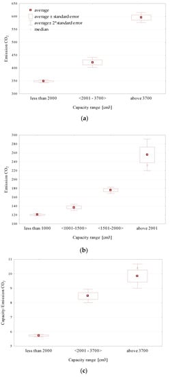 A comparative analysis of car groups was also carried out in terms of the following variables: Emission CO2, Capacity/Emission CO2, Power/Emission CO2. The variable categorizing into independent groups was the category according to the engine displacement. The analysis concerned cars produced in America, Europe, and Asia separately.
