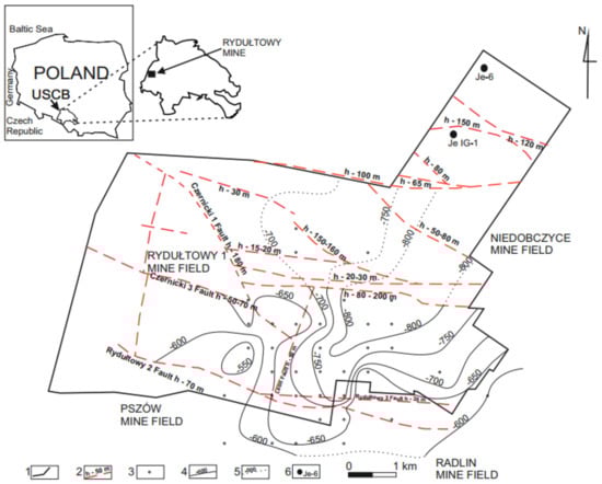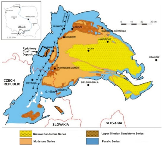 The Rydułtowy hard coal deposit is located in the western part of the Upper Silesian Coal Basin, which is one of the largest in Europe, with an area of 7250 km2, including 5650 km2 in Poland. The other part is in the Czech Republic [] (Figure 1).