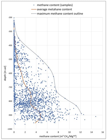 The depth distribution of the methane content in the study area includes two zones (Table 2, Figure 2). The upper one, which was naturally degassed in the geological past, is located at a depth of about 600 m below ground level, where methane is absent or occurs in very small quantities (0.0 to 0.8 m3/t coal daf), and the lower methane zone extends from a depth of about 600 m to the bottom of the deposit, where the methane content increases consistently, reaching a maximum measured value of more than 14 m3/t coal daf at a depth of approximately 1160 m (−910 m above sea level). The depth range of the methane zone has not been identified thus far.