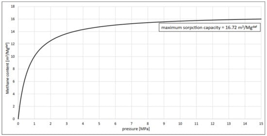 The coal sorption capacity of the methane at a given pressure and temperature was obtained from the literature []. Additionally, it was measured using a coal sample taken from a depth of approximately 1000 m in the Rydułtowy mine. The measurement device was a Hiden Isochema sorption apparatus, model IGA 001.
