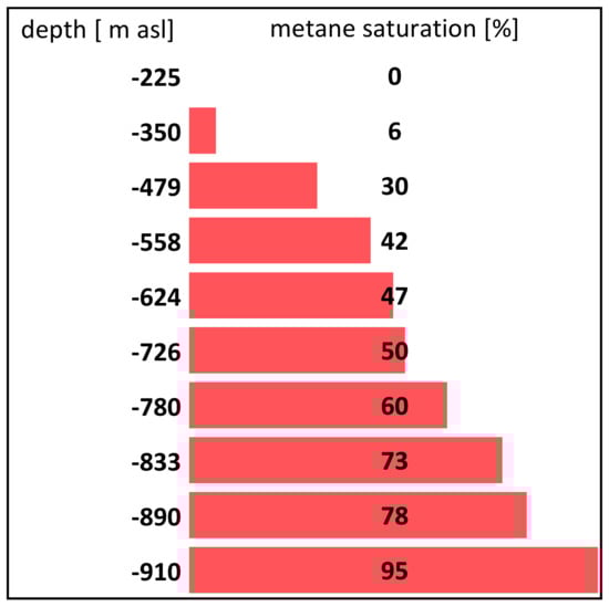 The maximum methane content recorded at a depth of 900 m below sea level (~1200 m below ground level) was 14–15 m3/t coal, which means that the coal seams are saturated with 95% methane (Figure 5). The methane content in the Rydułtowy area generally increases with depth; therefore, shallower deposited, less methane-rich coals are less saturated with gas, with a content ranging from 30 to 78% (depth of 500 to 900 m below sea level) (Figure 5).
