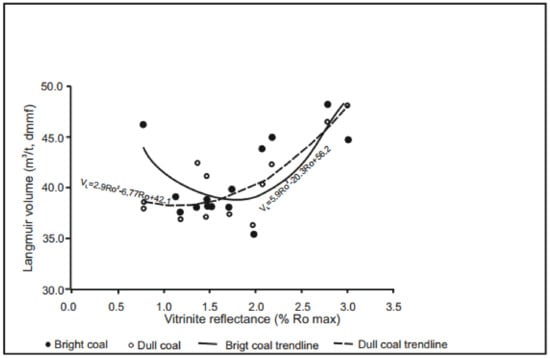The fact that the coal rank has such a negative impact on the sorption capacity of coal requires special attention, because other studies, [,] suggested a positive correlation between these values. Research carried out on Australian coals [] showed that the trend of the changes in the sorption capacity of coal with increasing rank is a second-order polynomial and differs between the cases of bright and dull coal (Figure 6). At the lower coal rank, this difference is greater than it is at the higher rank. Moreover, up to the value of 1.65% Ro, we observed a negative influence of the increasing rank on the sorption capacity of the coal, especially in the case of bright coal. From this point, starting with a 1.65% Ro value, the trend becomes clearly positive (Figure 6).