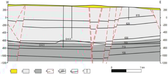 Carboniferous sediments are cut by numerous faults, with displacements up to 200 m with a latitudinal (predominant) and meridional course and an inclination of the fault planes of 45–85°. Zones of tectonic disturbance are up to 300 m wide; therefore, they can act as migration pathways for methane. Most likely, the majority of methane migrated through the faults and accompanying fractures in the past, contributing to the present-day distribution of the methane content in the deposit. The 4D modelling of the methane potential in the USCB [] revealed that the decisive influence on the level of hydrocarbons accumulated today is the time of tectonic activity in the study area, i.e., the length of the fault opening interval.