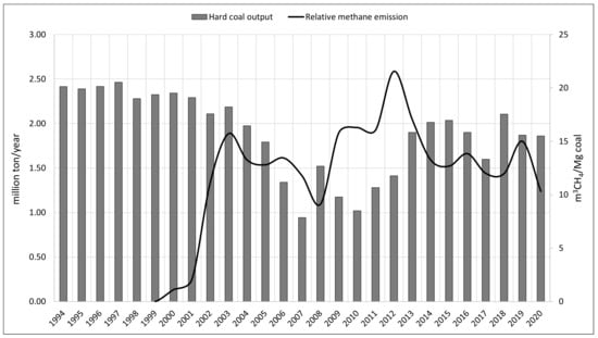 Hard coal output and specific methane emissions from 1994–2020 in the Rydułtowy mine.