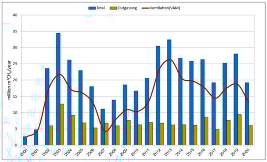 Total methane emissions and outgassing and ventilation air methane from 2000–2020 in the Rydułtowy mine.