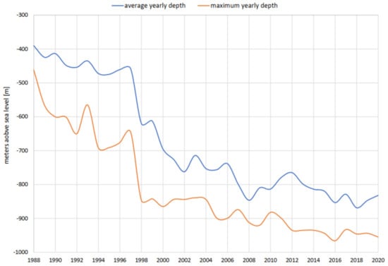 The hard coal output was studied in the years 1994–2020 (Figure 8), while the methane emissions were studied in 2000–2020 (Figure 9), because earlier coal had been extracted from the methane-free coal seams; therefore, no CH4 emission was recorded. At the beginning of these studies, coal was extracted from the Poruba and Jaklovec layers at a depth ranging from 400 to 700 m below sea level, including mostly degassed, methane-free coals (Figure 10).