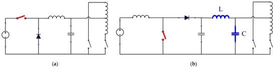 Buck and push–pull, and boost and push–pull are two different topologies, as shown in Figure 1. Based on the system requirement, if EPC has some malfunctions or failures, it cannot affect other modules in the satellite. If in the fault mode, the power switch (the red one) in Figure 1a can be turned off and thus can prevent affecting the bus voltage in the satellite. However, in Figure 1b, the power switch (the red one), when turned off, cannot prevent affecting the bus voltage, and it must include an additional protective circuit. Moreover, if ZVS and ZCS need to be realized in a boost and push–pull topology, extra inductance and capacitance (the blue ones) need to be added to the circuit, which increases the complexity of the circuit.
