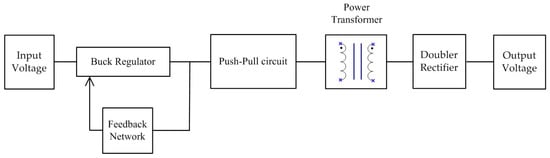 In addition, the high-voltage output is achieved through a soft-switching push–pull converter. The block diagram of this two-stage converter is shown in Figure 2. Closed-loop feedback is applied in the buck regulator to provide stable voltage for the push–pull circuit, and the push–pull circuit works in an open-loop state with a high output voltage after a doubler rectifier circuit.