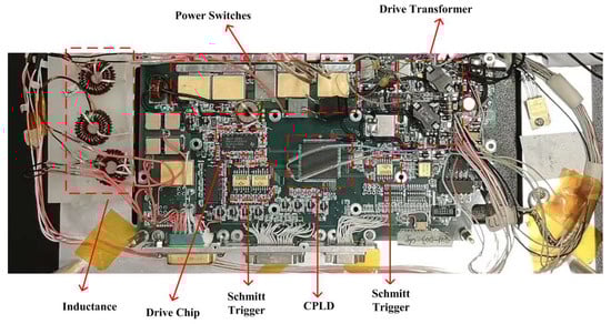 As shown in Figure 11, a laboratory prototype of the EPC was fabricated to verify the ZVS and ZCS in the two-stage DC/DC converter, along with other characteristics. In the converter, there are four power switches: two switches are used in the buck regulator and another two switches are used in the push–pull circuit. The driver transformer is used to isolate the drive signals because the source electrodes of power switches in the buck circuit connect to the non-zero level. The inductances include one buck inductance and two filter inductances in input voltage. CPLD is used to generate control signals and control the sequence relationships.
