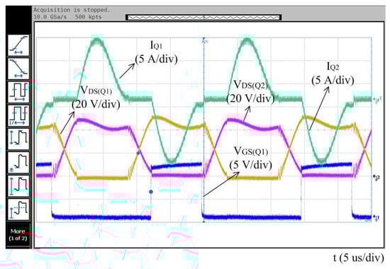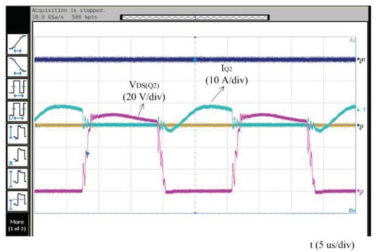In the same load condition (130 W), the parasitic capacitance and leakage inductance are used to form the resonant tank. Moreover, another two-stage converter, boost and push–pull, can realize ZVS but cannot realize ZCS. The drain-source voltage also increases and reaches 70 V, as shown in Figure 13.