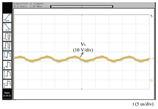 Figure 12 shows that ZVS and ZCS can be realized in both the on and off states. The waveforms of both and are approximately trapezoidal, and and are sinusoidal. There is no voltage spike or overshooting current. The peak voltage of the switches: