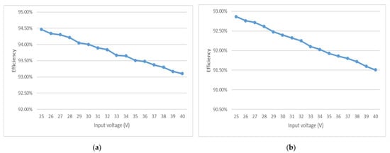 The bus voltage in satellites always varies, but the target of high efficiency never changes. Figure 15 illustrates the variation in efficiency in different input voltages, where Figure 15a illustrates the efficiency when the output power is 130 W, while Figure 15b shows the efficiency when the output power is 75 W. The lower input voltage or the heavier load leads to a higher duty cycle for the buck converter. As a result, the efficiency of the DC/DC converter increases as well. The highest efficiency can be up to 95%.
