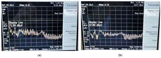 Figure 16 shows the test result of the conducted emission of this two-stage converter in different switching conditions, where Figure 16a presents the test result when the converter worked in hard switching, while Figure 16b shows the result when the converter worked in soft switching. According to the test results of conducted emission, when the converter worked in ZVS and ZCS, the interference of conduction emission was smaller than that in hard switching.