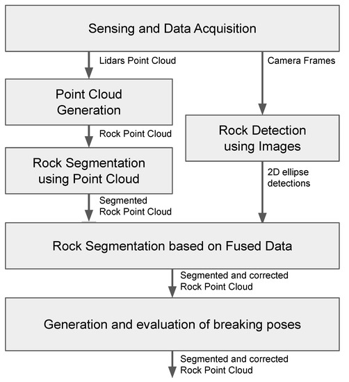 To determine the rock-breaking target poses, it is necessary to generate a representation in which each rock in a given rock pile is properly individualized. This individualization, referred to as instance segmentation, should provide a three-dimensional representation of the rocks, which would allow the hammer to strike them. To achieve this goal, 3D points and images are captured by sensors, allowing the generation of a 3D model of the workspace, as well as a characterization of the colors and textures present in the environment. Although the system may work with different range sensors and cameras, the current implementation uses two 3D LIDAR sensors (laser scanners), and two visible spectrum cameras.