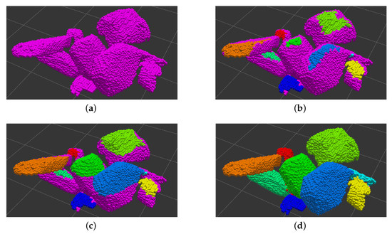 Example of rock segmentation using watershed on a point cloud. (a) Raw point cloud. (b) Result after initial labeling. (c) Intermediate result of the flooding process, where the initial labels are propagated from a higher level, up to an intermediate level. (d) Final result of flooding process, where all label are propagated until the lower level.
