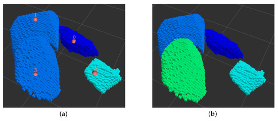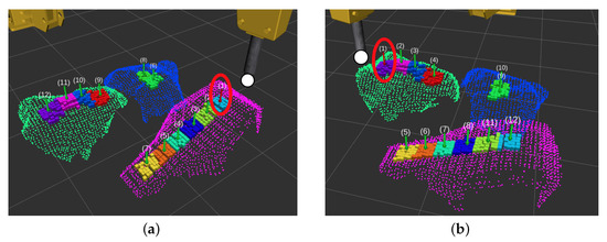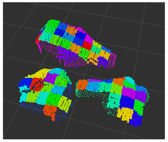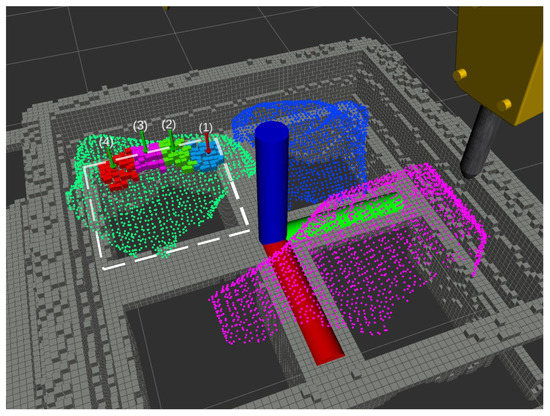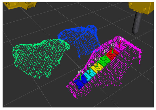 - All the rocks that would not pass through the grizzly (because of their estimated volume) are considered for the breaking rock target pose search. In these cases, the rocks’ corresponding points are grouped considering their position projected in the virtual grid cells (described previously). Thus, each of these groups of points is a sub-region associated with a particular rock. An example of these groupings is illustrated in Figure 9.
