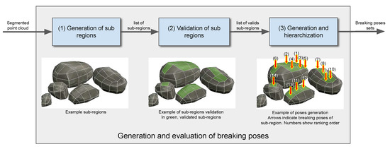 A rock breaking pose from each sub-region is generated and then hierarchized. To generate a pose, the sub-region’s center, projected in the plane, is assigned as the pose’s position. The pose’s orientation is always predefined as vertical, i.e., with an orientation parallel to .