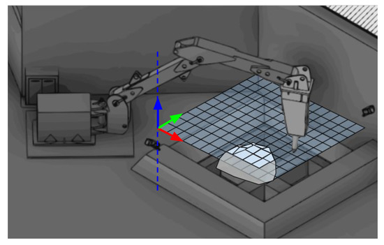 To make a proper analysis of the breaking success related to each sub-region, it is necessary that these regions ensure that the tip of the chisel makes contact only with the points within the sub-region. In general, the chisel of an impact hammer that would be typically used in mining facilities is a steel cylinder with a diameter between 8 cm and 12 cm, ending in a rounded tip. Considering the most extreme case in which the wear on the tip is maximum, the tip of the hammer would cover the area of a circle with a radius of 6 cm. For this reason, each sub-region is represented as a square of size 12 cm × 12 cm. This design decision ensures that, from a three-dimensional perspective, the contact area between the hammer’s end effector and a rock is always less than the area covered by a given sub-region.