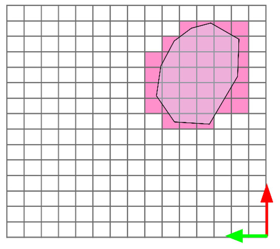 Representation of the rocks’ projection on the plane (the red and green arrows represent the X and Y axis, respectively). The magenta grid cells are non-empty (below them there is at least a single point). The white grid cells are empty (below them there are no points).