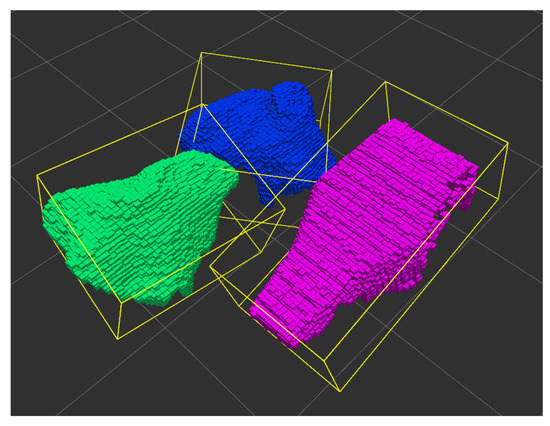 - To evaluate whether or not a rock would pass through the grizzly, a rough estimation of its enveloping volume is made. This allows identifying the rocks that, due to their large dimensions, would not be able to easily pass through the grizzly (i.e., the rocks that the system would target during the crushing process). To estimate the rock’s enveloping volume, a 3D bounding box is constructed for each rock, using their respective point cloud. A graphic example of these bounding boxes is illustrated in Figure 8.