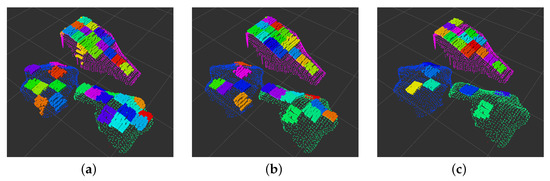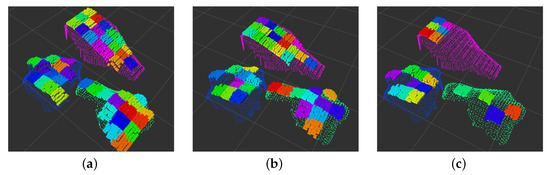 Finally, the resolution of the data is reduced to allow faster processing. To accomplish this, the data are subsampled using voxels, where the spatial locations of all the points contained within a given voxel, , are represented by a single centroid point, . These centroids are defined by Equation (1), that is, their coordinates are the average coordinates of the points contained inside their corresponding voxel.
