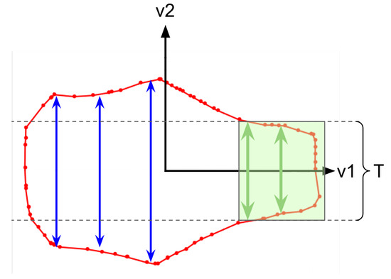 Once the centroids have been calculated, the other parameters of the ellipse in the point cloud space are computed according to Equations (7)–(9), with and defined by Equations (10) and (11), respectively.