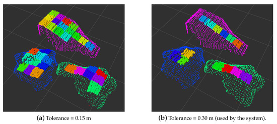 Afterwards, the morphological operations of dilation and erosion are applied on the binary labels assigned to the point cloud, “connecting” the labels of points that are close to each other, according to a predefined proximity radius. These morphological operations effectively remove small connected components of labeled points, whilst combining connected components that are close to one another. Finally, the resulting labels are clustered into new labels according to the proximity of their corresponding points, and these groups are individualized by re-labeling the points that conform them. These new labels are codified using natural numbers starting from 2 and up until , depending on the number of groups.