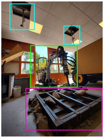 Experimental setup used for real-world testing. The Bobcat E10 hydraulic mini-excavator is marked with a green frame, the grizzly is marked with a magenta frame, and the sensors (LIDARs and cameras) are marked with cyan frames.
