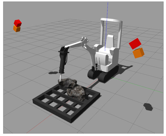 Although several scenarios simulating real mining sites’ conditions were built for Gazebo, to adjust the system’s parameters for this setting, and to model the mini-excavator itself, we replicated the real world’s experimental configuration in the simulator, as shown in Figure 19.