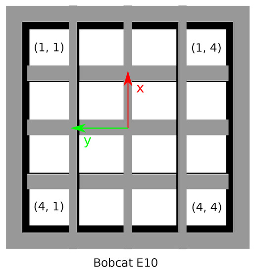 The hydraulic mini-excavator and the scaled steel grizzly have, approximately, a 1:2 scale with respect to a typical impact hammer used in mining sites. Furthermore, the grizzly has 16 cells for which small sized material could pass. Let us assign a pair of indices to each of these cells, counting rows and columns from 1 to 4, as illustrated in Figure 20.
