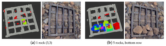 The data show that the instance segmentation performance for all the experiments when no overlapping between rocks occurs is correct (that is, experimental configurations “1 rock”, “4 rocks corners and center”, and “8 rocks center + corners”). This result showcases that the instance segmentation subsystem easily differentiates rocks when they are represented by disconnected clusters of points.