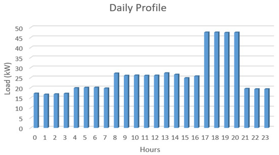 The principal load was estimated to be 752.75 kWh/day, whereas the annual peak demand was 53.82 kW. The load demand is provided in Figure 3.