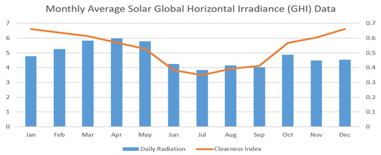Geographical coordinates information is used in the clearness index to display monthly average global radiation statistics from the National Renewable Energy Laboratory (NREL). Solar radiation is at its highest from February to May, as seen in Figure 4. The yearly clearness index on average is 0.5312, while the daily radiation on average is 4.81 kWh/m/day.