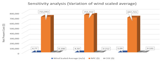 The NPC and COE are also heavily influenced by wind speed. Figure 13 show that increasing the wind speed from 4.77 m/s to 5.00 m/s decreases the NPC and COE. The NPC and COE were USD 711,943 and USD 0.200 while the wind speed was 4.77 m/s, and they decreased to USD 697,715 and USD 0.191 when the wind speed increased to 5.00 m/s. On the other hand, the NPC and COE are USD 751,552 and USD 0.212, respectively, when the wind speed drops from 4.77 m/s to 4.50 m/s. NPC and COE decrease as wind speed increases, and NPC and COE increase as wind speed decreases.