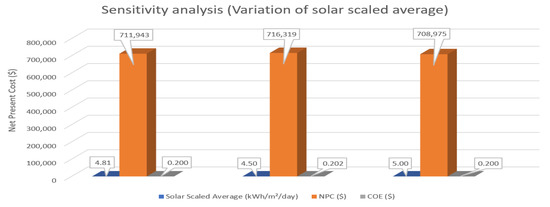 The hybrid alternative using PV, wind, battery, and direct-drive generators is graphically illustrated in Figure 14 by changing the solar irradiation. It is obvious that the NPC and COE are influenced by changes in solar radiation. For instance, the NPC and COE are USD 711,943 and USD 0.200 at 4.81 kWh/m/day solar radiation, but they rise to USD 716,391 and USD 0.202 at 4.50 kWh/m/day solar radiation. However, the NPC and COE are USD 708,975 and USD 0.200, respectively, when the solar radiation reaches 5.00 kWh/m/day. NPC is lower, even if COE is the same as when solar radiation is 4.81 kWh/m/day.