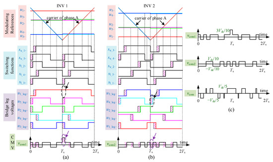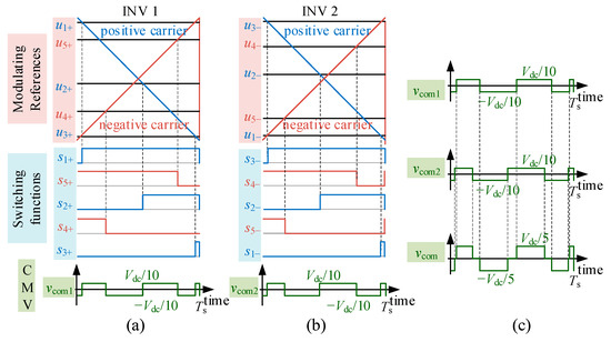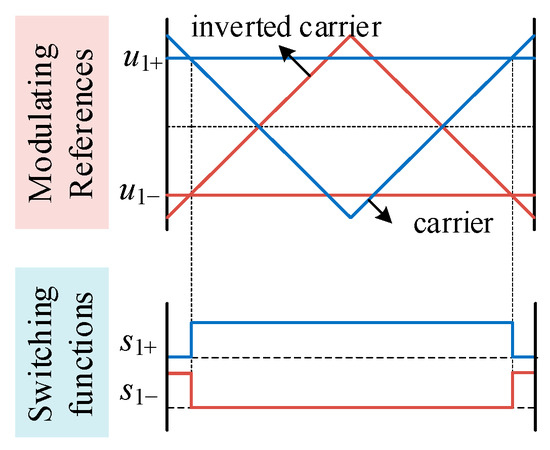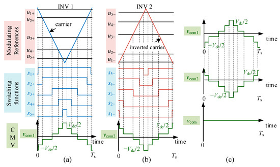 According to Equation (1), if −1 and 1 exist in pairs in switching functions, sum of the switching functions will equal zero, leading to zero CMV. Actually, this requirement can be easily satisfied in open-winding topologies. Considering that voltage references are inversed in two INVs, if reversed carriers are further employed for INV 2, switching functions of the bridge legs belonging to the same phase are always complementary, as shown in Figure 3. As a result, their CMV contributions are cancelled.