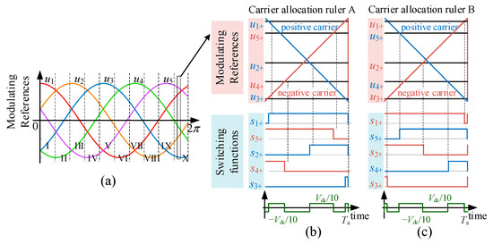 Under CSPWM, firstly, reversed carriers are employed for bridge legs with different up-down states, leading to reduced amplitude of sub CMV. Secondly, triangular carriers are replaced by sawtooth carriers to further reducing the step frequency of sub CMV, which is meaningful to reduce the CMV effects on the machine system [24]. As shown in Figure 5, five voltage references can be divided into 10 sectors in a fundamental period according to their up-down states. The carrier type of each bridge leg remains unchanged inside the sector, but changes when sector switches. Take the INV 1 in sector X for example, positive (right-slanting) sawtooth carriers are employed for rising voltage references , and , and negative (left-slanting) sawtooth carriers are employed for falling voltage references and . As a result, switching pulses of phase A, B and C have right side distributions, meanwhile that of phase D and E have left side distributions. It ensures the sum of switching functions in INV 1 varies between ± 1. Hence, the amplitude of declines to , which is 1/5 of that under the traditional CPWM. Additionally, comparison operations of the carrier waveform and the reference waveform occur on the single edge of the sawtooth carrier, leading to reduced CMV step times, which is 6 in a switching period (10 times under the traditional CPWM).