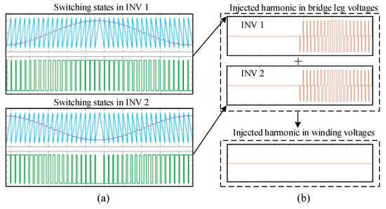 The (a) PWM state in two inverters and (b) injected harmonics of the bridge legs voltage and the winding voltage.
