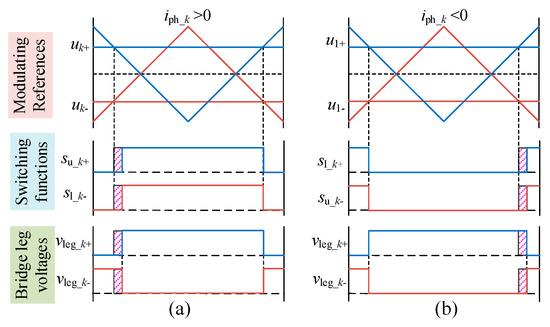 With the above analysis, bridge legs voltages and under CRPWM are as shown in Figure 10. When the winding current , there will be and . Hence, the waveform of is consistent with , and the waveform of is the inversion of as shown in Figure 10a. Obviously, edges of and are shifted simultaneously and the complementary state remains.