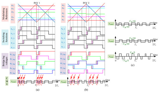 As shown in Figure 2, switching function waveforms are centrally distributed due to the symmetrical triangular carriers, and centers of two sub CMVs, and , are symmetrical. After summing two sub CMVs, has 11 levels and steps 20 times in a switching period. reaches the maximum or minimum ( or ) when carriers reach the peak or valley values. Obviously, 11 possible levels and the theoretical maximum amplitude of CMV appear under the traditional CPWM.